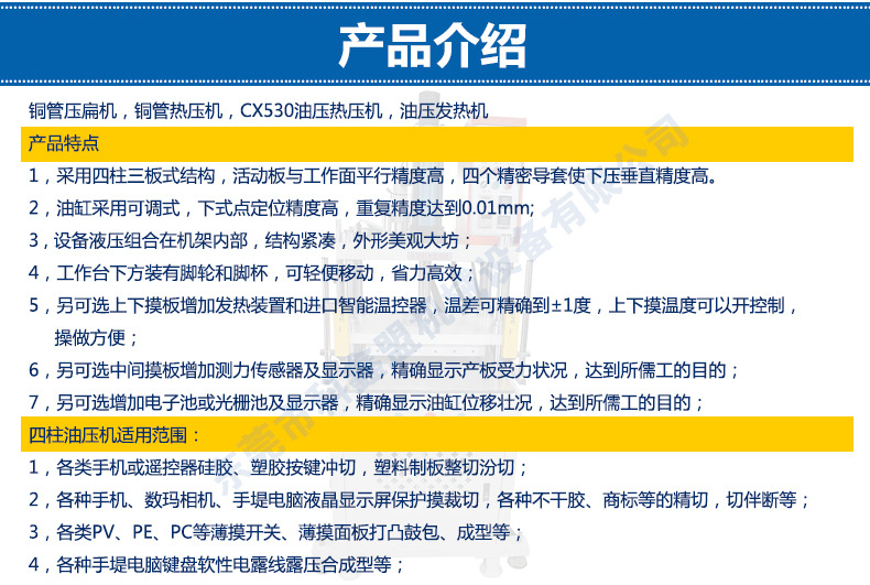 科鑫盟CX530系列油压热压机,液压热压机采用四柱三板式结构,上下模板增加发热装置和进口智能温控器,液压系统内置油箱底部,外观整洁,稳重. 工作台下方装有脚轮和脚杯,可轻便移动。